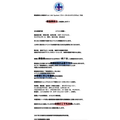 緊急時の対応に医療従事者(救急救命士)がいると言う安心をイベント主催者様が集客されるお客様に提供出来る環境を私たちと共に創っていきましょう。