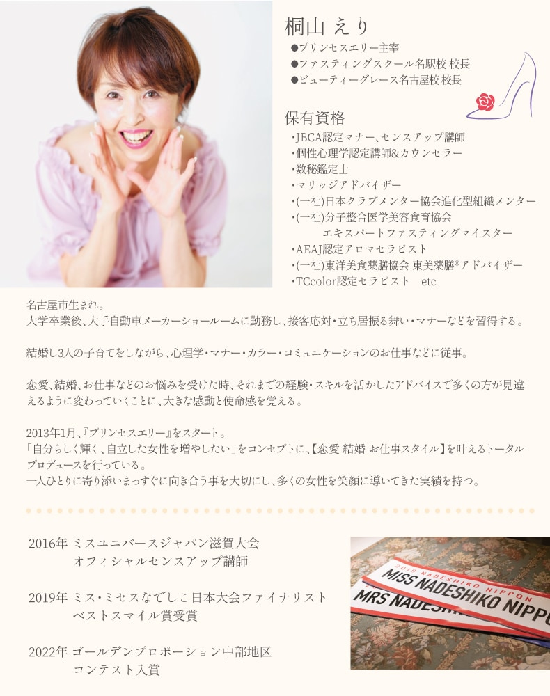 名古屋婚活マナー講座【プリンセスエリー】では美容、食育、心身の健康などあなたの幸せなライフスタイルのためにオーダメイドでトータルサポート。オンラインレッスンも取り入れています。