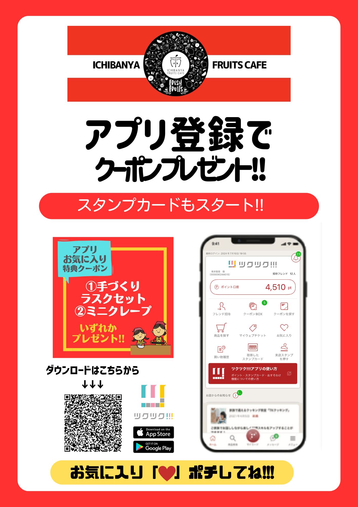 ▶︎アプリダウンロードしたら「ICHIBANYA FRUITS CAFE」ページでお気に入り「❤️」クリックいただきますと、お得なお気に入りクーポンをプレゼント中です!