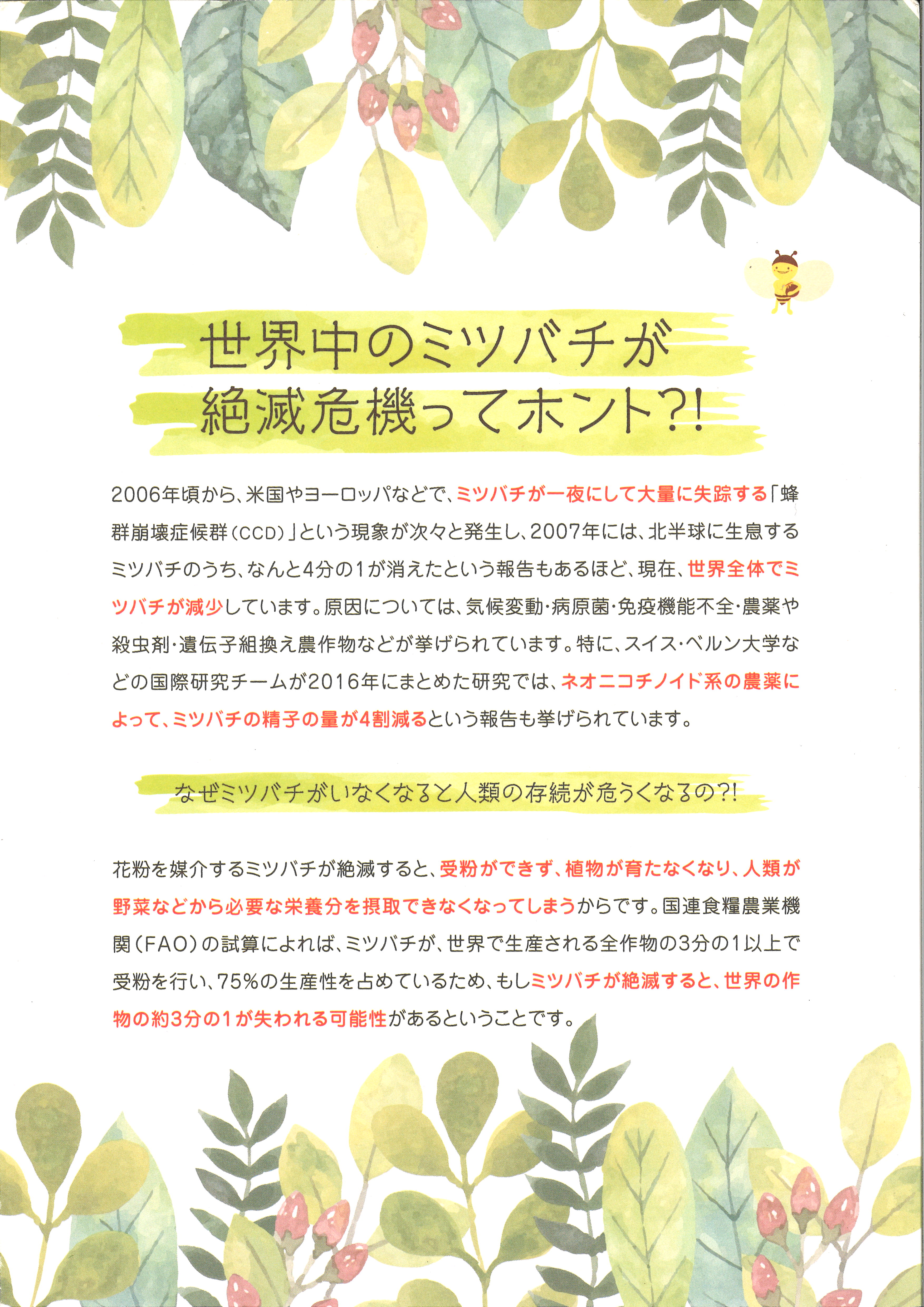 2006年頃から世界中でミツバチが一夜にして大量に失踪する「蜂群崩壊症候群」という現象が次々と発生し、2007年には北半球に生息するミツバチのうち、なんと4分の1が消えたという報告があるほど、現在、世界全体でミツバチが減少しています。