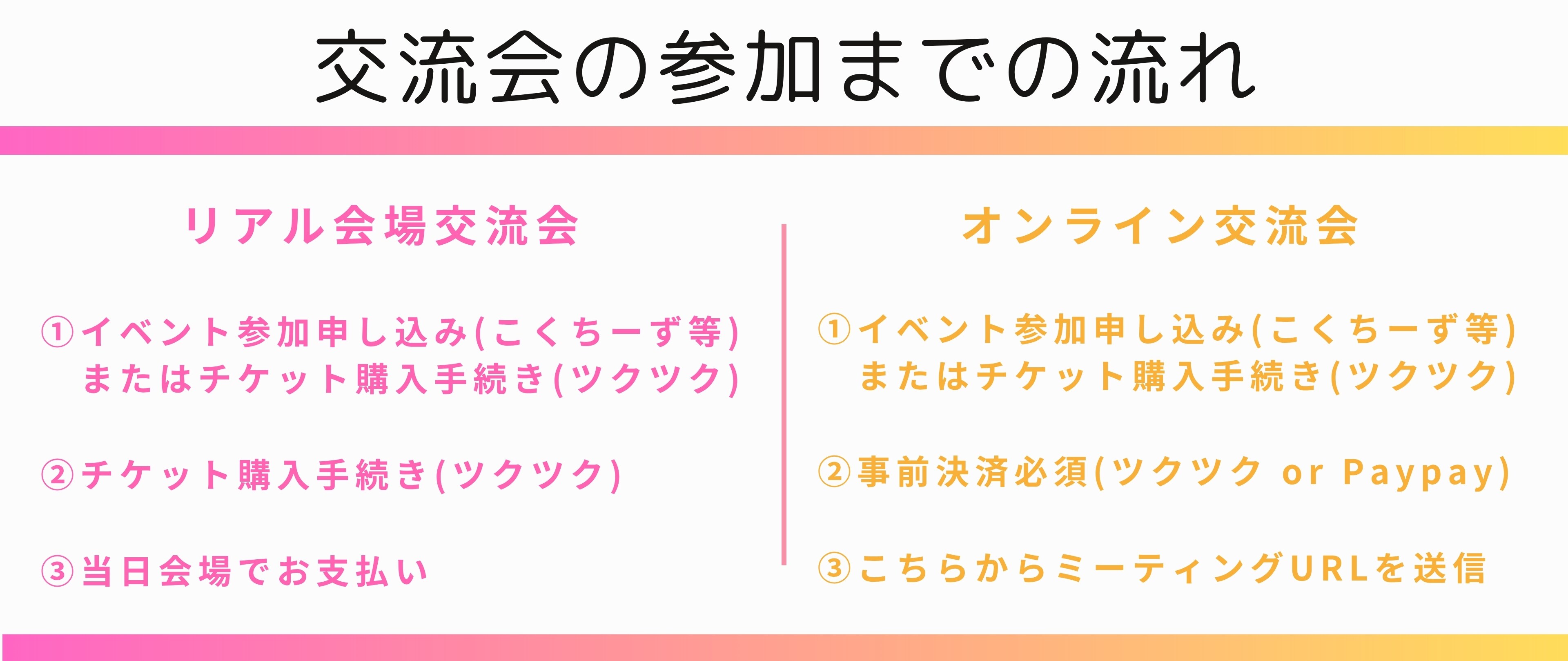 ※ツクツクで購入手続き時、クレジットカード決済を選んだ場合は、購入手続き完了時点で参加可能となります。(決済はその場では行われず、交流会参加の確認後に決済いたします。)