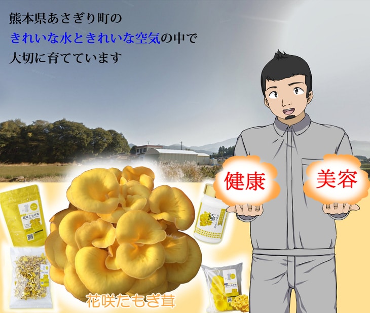 このショップでは、黄色いきのこ「花咲たもぎ茸」に関連した商品を中心に、地元熊本の「健康にいいモノ」