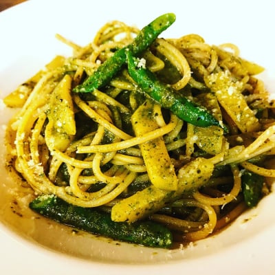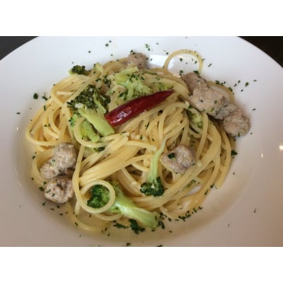 『つるちゃんねぎとたもぎ茸のペペロンチーノスパゲッティ』