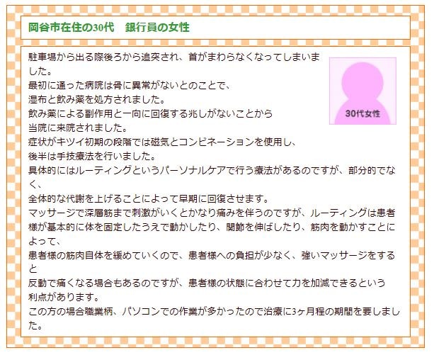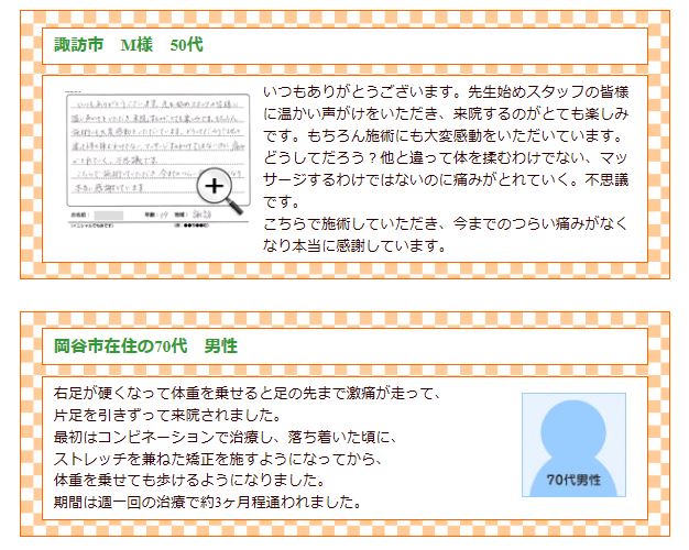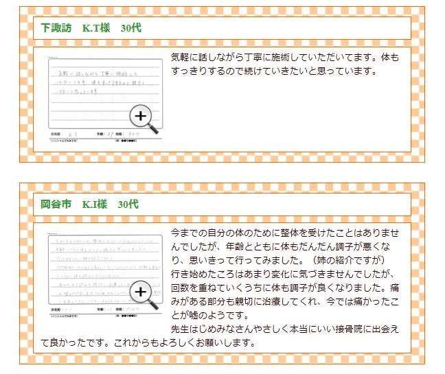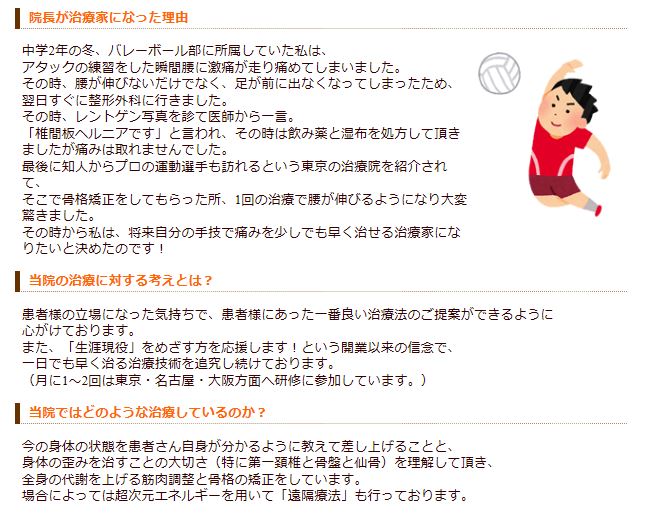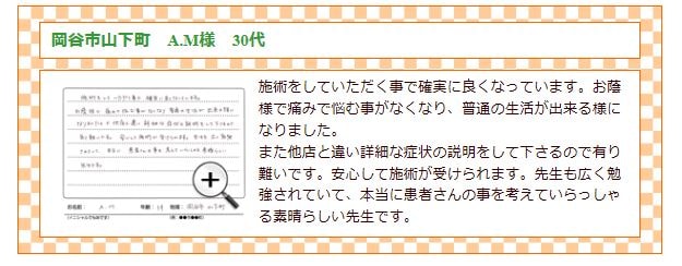 又、他店と違い詳細な症状を説明して下さるので有難いです。安心して施術を受けられます。先生も広く勉強されていて、本当に患者さんのことを考えていらっしゃる素晴らしい先生です。
