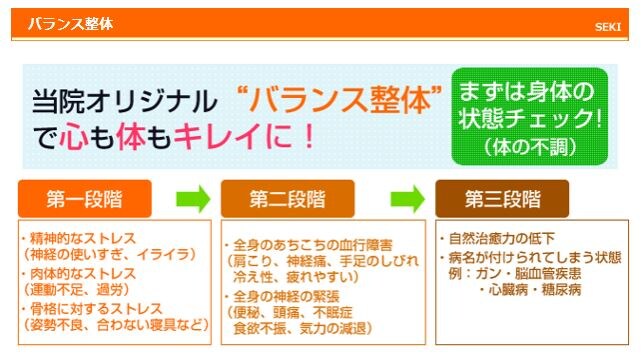 "これからは予防の時代です!"自覚症状が出る前に、身体の定期的なケアをおススメします。実際に"バランス整体"を続けている患者様からは「疲れにくくなった」「朝起きた時の目覚めが良くなった」「腰の痛みを感じない」等の体験談を頂いております。