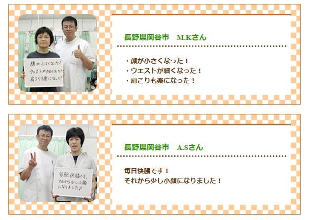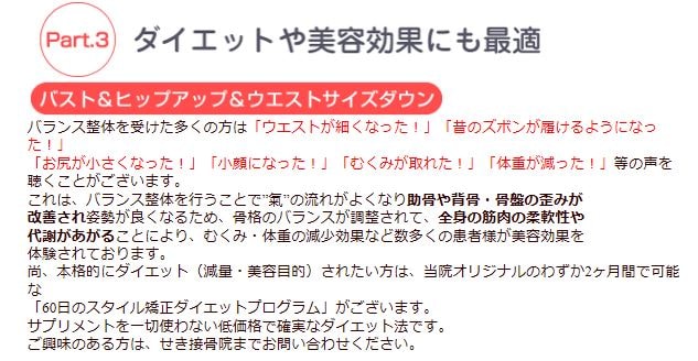 バランス整体を行うことで、肋骨や背骨・骨盤の歪みが改善され姿勢がよくなるため、骨盤のバランスが調整されて、全身の筋肉の柔軟性や代謝が上がることにより、むくみやくびれ・体重の減少効果(2〜4kg)等、数多くの患者様が美容効果を体験されています。