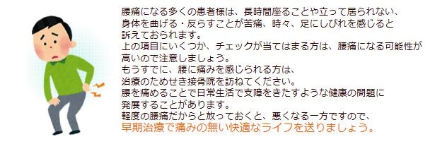 痛みやしびれ等の自覚症状が出てからでは症状の改善や治療するまでに、かなりの時間を必要とするケースが多くみられます。