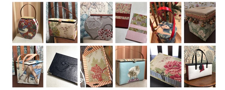 紙と革、イギリス生地・フランスリボン・ゴブラン織・着物など新しいモチーフを模索しながら、作品の発表に努めています。