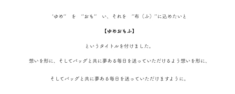 ‘‘ゆめ‘‘ を ‘‘おも‘‘ い、それを ‘‘布(ふ)‘‘に込めたいと【ゆめおもふ】というタイトルを付けました。