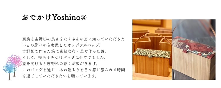 2019年、吉野杉バッグ[おでかけYoshino®]を発表し、2020年商標登録済み。