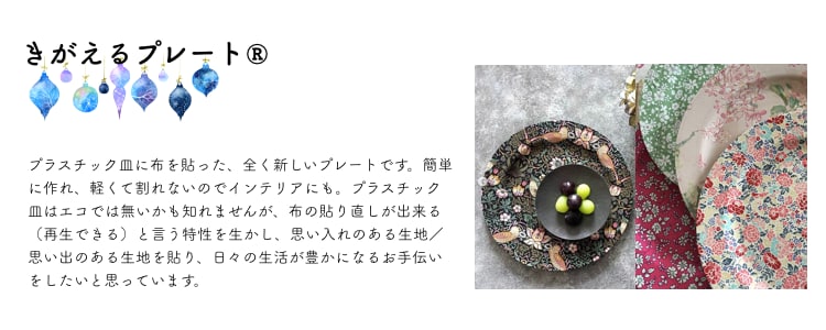 2017年、プラスチック皿に布を貼る[きがえるプレート®︎]を商標登録し、暮らしの中での取り入れ方をご提案しながら講座開催をしています。