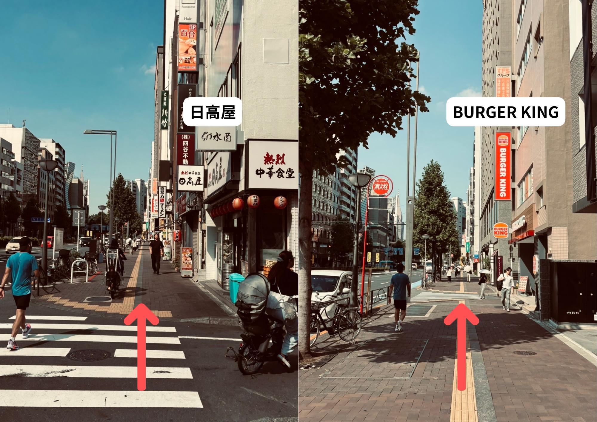 3しばらく直進する。「日高屋」⇒「BURGER KING」の順で通り過ぎます。