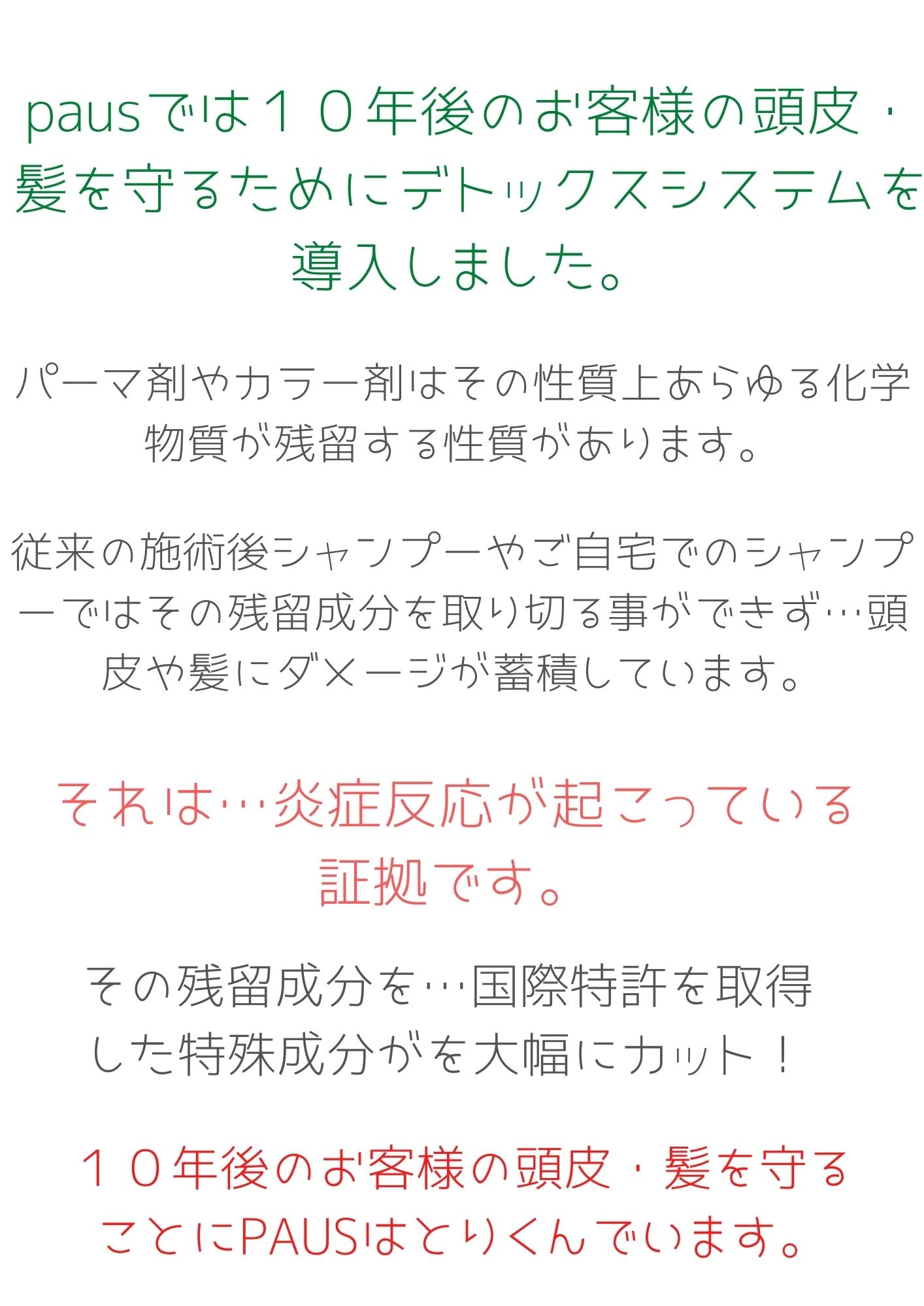 特に、カラー剤・パーマなどの薬剤除去に力をいれていて、お客様の10年後も綺麗でいられるように薬剤を使う全メニューに導入しております。