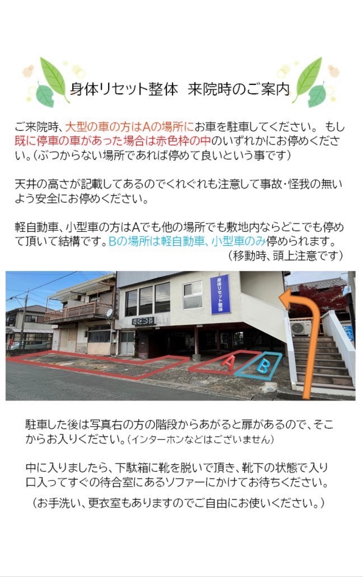※駐車場は大きいお車でお越しの方は西側の隣の建物の前に横づけの向きでお停めください。(身体リセット整体から1件西側の建物の前にお停めできます。)