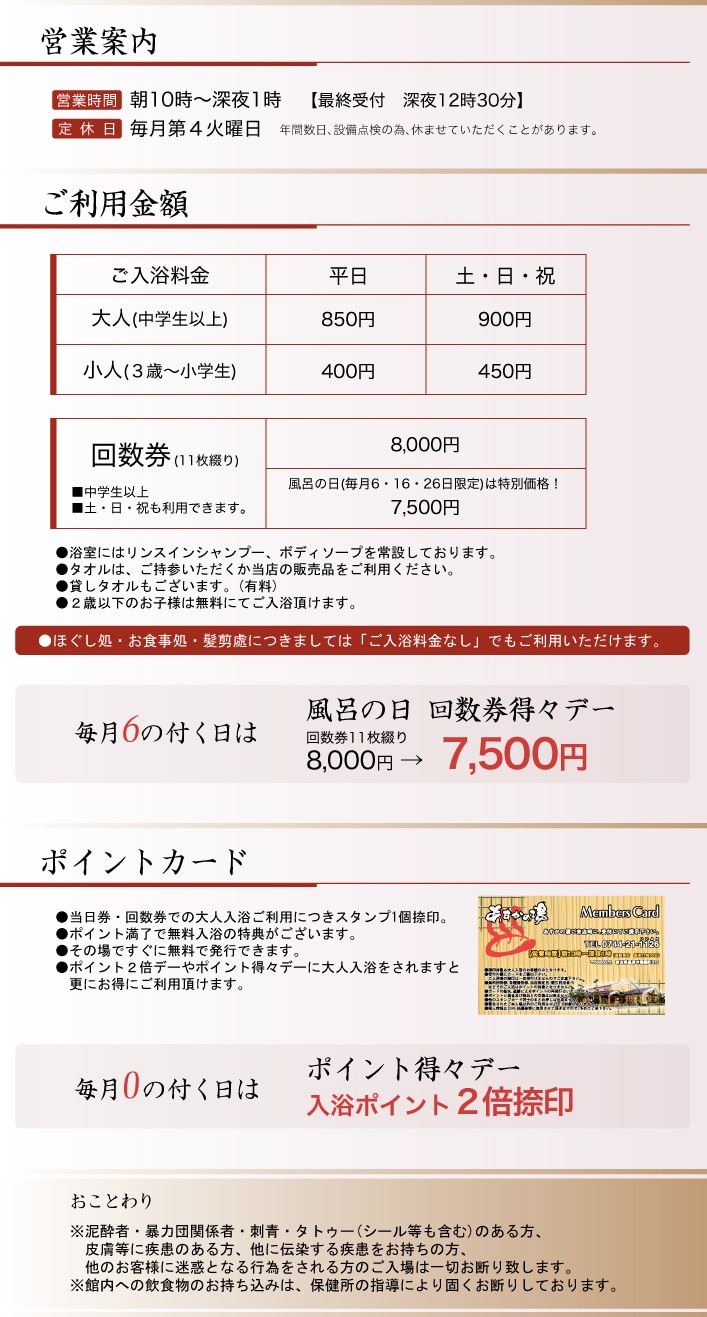 ※ほぐし処・お食事処・髪剪処につきましては「ご入浴料金なし」でもご利用いただけます。