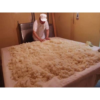 米麹は日本酒と同じ作り方です。蒸した米に、種麹を振りかけて揉み、麹蓋に移して休ませます。その後、甘酒にした後、約2週間、24樽を計6,000回近くかき混ぜます。混ぜる回数は父の長年の試行錯誤から導き出したもの。今も人に任せず、米麹専用の工房に一人寝泊まりしながら、もくもくと作業を続けています。