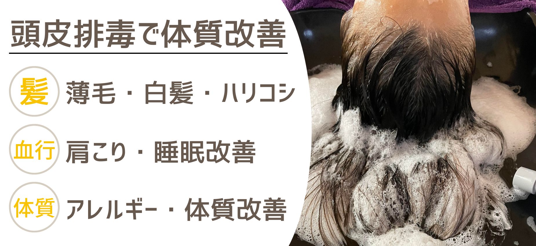 頭皮から排毒することにより、髪、皮膚やアレルギーなどの体質、頭痛、肩こり等のお悩みから解放できるようサポートいたします。