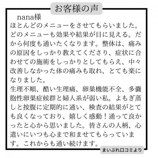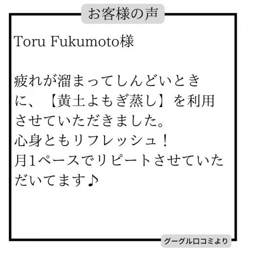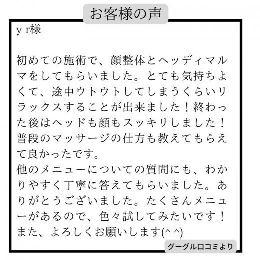 今回は、全身のだるさと痛みが強く受けさしてもらいました。 毎回、ピンポイントに色々と施術をしてもらうので助かっています。