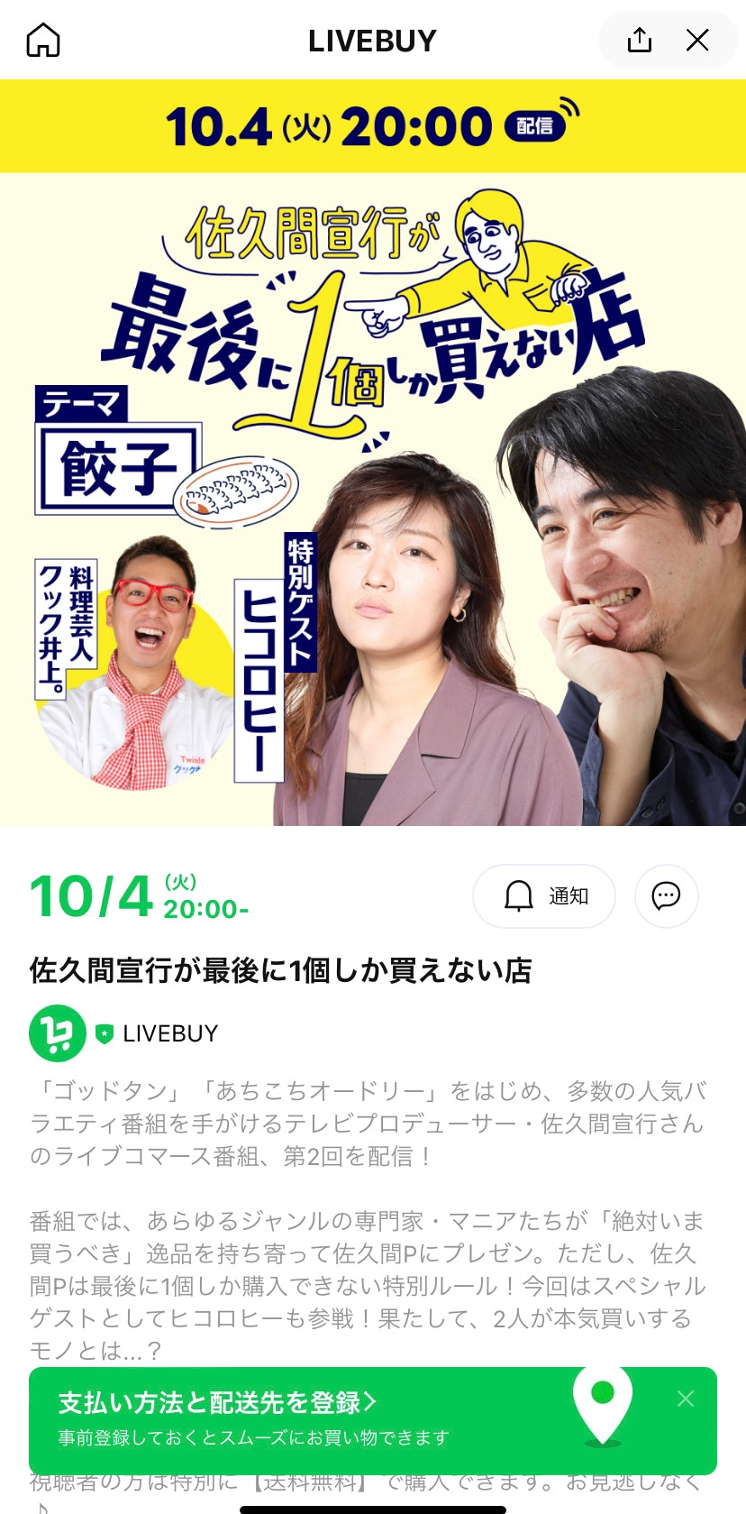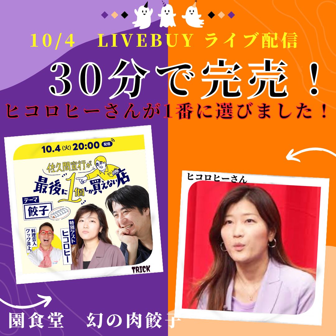 各店の紹介中にもライブ購入できるのですが、購入履歴がチャットのように表示されるのです。そんな中!なんと!紹介される前に【完売】してしまいました!あまりの売れ行きに追加でアーカイブでの販売も開始して対応しましたが本当に驚きの販売力!破壊力!企画力!楽しみながら観て購入できる新しい販売チャネルの登場だと思いました!引き続き本日10月5日(水)23:59分までの販売です。配信内容も見ることができますのでお時間ある方は是非ご覧くださいませ。▼番組視聴URL(スマホから視聴できます) ↓