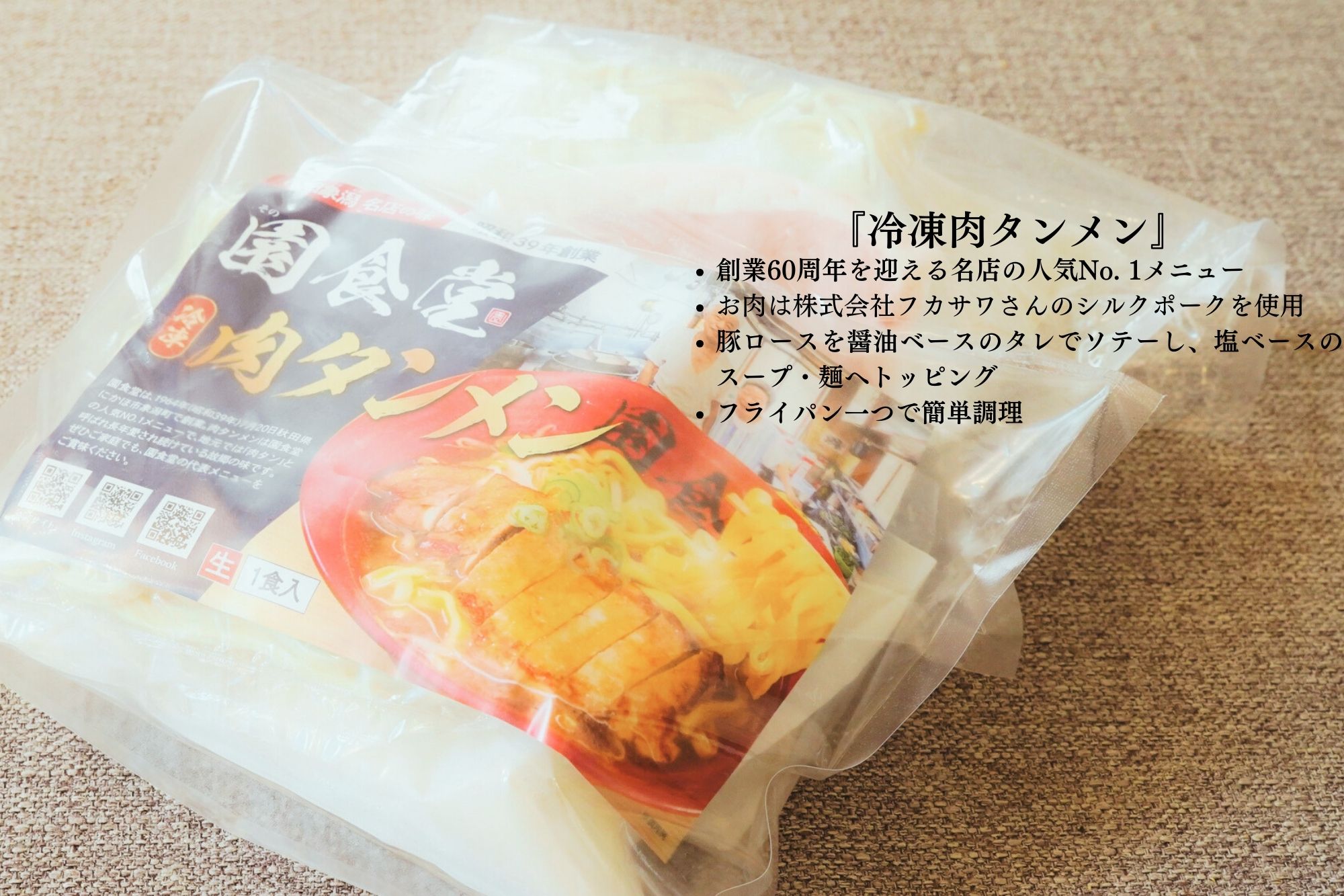 豚ロースと肩ロースを甘辛くソテーし、塩ベースのあっさりスープと太めの平打ち麺にたっぷりトッピングしたこの一品は、地元で“秋田のご当地ラーメン”として長年親しまれてきました。現在は冷凍便で全国発送が可能となり、ご自宅でも簡単に食堂の味を再現できるようになっています。