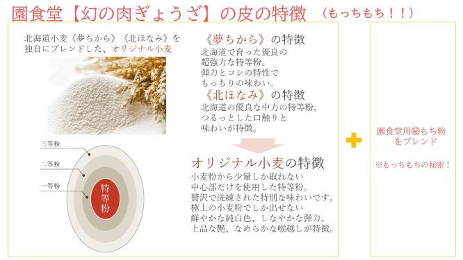 それは厳選された小麦粉の配合と、【幻の肉餃子】だけに使用されるもち粉にあった!皆様も是非!
