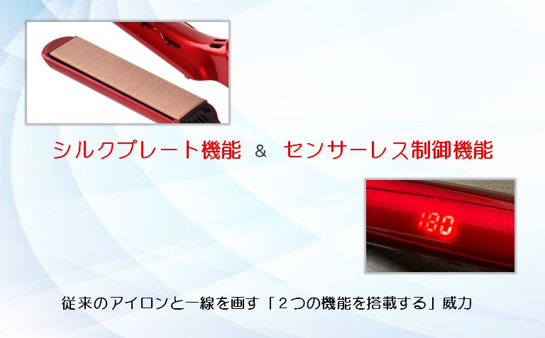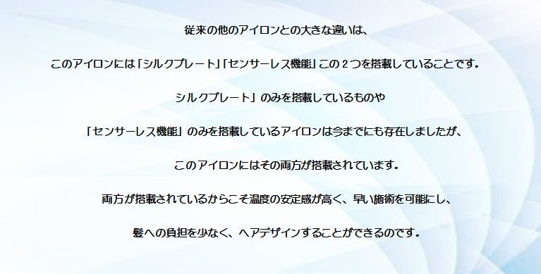 従来の他のアイロンとの大きな違いは、このアイロンには「シルクプレート」「センサーレス機能」この2つを搭載していることです。「シルクプレート」のみを搭載しているものや「センサーレス機能」のみを搭載しているアイロンは今までにも存在しましたが、このアイロンにはその両方が搭載されています。両方が搭載されているからこそ温度の安定感が高く、早い施術を可能にし、髪への負担を少なく、ヘアデザインすることができるのです。