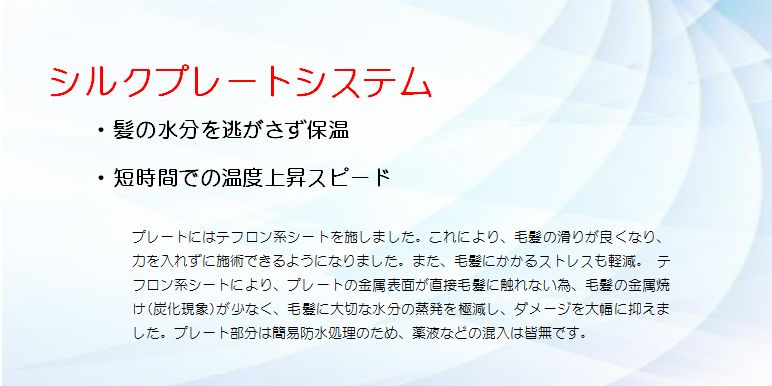 プレートにはテフロン系シートを施しました。これにより、毛髪の滑りが良くなり、力を入れずに施術できるようになりました。また、毛髪にかかるストレスも軽減。 テフロン系シートにより、プレートの金属表面が直接毛髪に触れない為、毛髪の金属焼け(炭化現象)が少なく、毛髪に大切な水分の蒸発を極減し、ダメージを大幅に抑えました。プレート部分は簡易防水処理のため、薬液などの混入は皆無です。