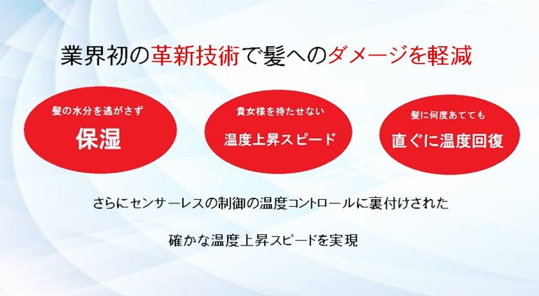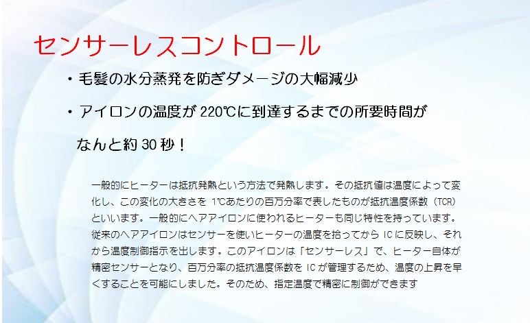 一般的にヒーターは抵抗発熱という方法で発熱します。その抵抗値は温度によって変化し、この変化の大きさを1℃あたりの百万分率で表したものが抵抗温度係数(TCR)といいます。一般的にヘアアイロンに使われるヒーターも同じ特性を持っています。従来のヘアアイロンはセンサーを使いヒーターの温度を拾ってからICに反映し、それから温度制御指示を出します。このアイロンは「センサーレス」で、ヒーター自体が精密センサーとなり、百万分率の抵抗温度係数をICが管理するため、温度の上昇を早くすることを可能にしました。そのため、指定温度で精密に制御ができます。