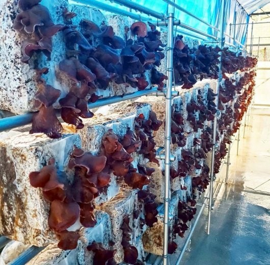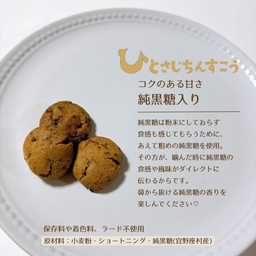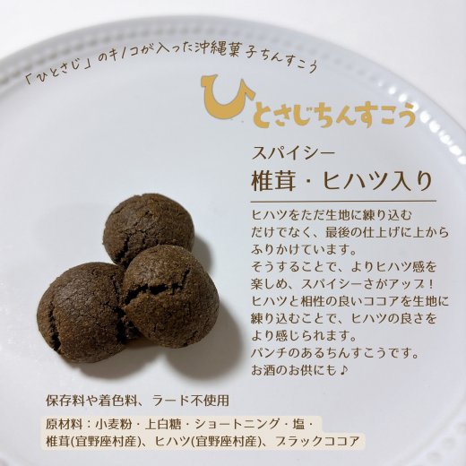 このちんすこうには、村自慢の「キクラゲ」や「ヒハツ(島椒)」、「椎茸」、「純黒糖」など