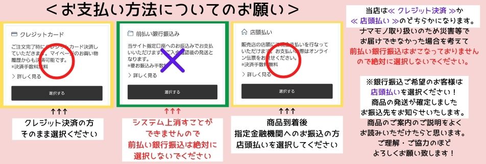 ◎店頭払い(商品到着後、金融機関へ振込) の2種類のみ対応しております。