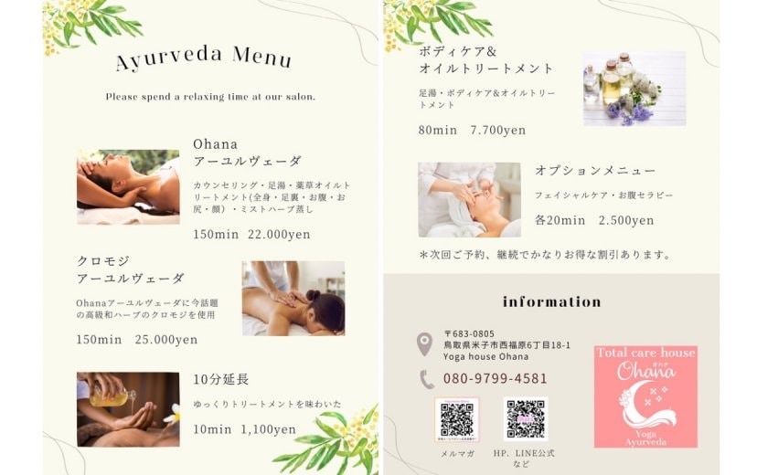 ヨガ、マヤ暦セッション、マヤ暦各種講座、アーユルヴェーダセラピー、リラクゼーションセラピー、オイルトリートメント、解毒足もみセラピー、どこでもミュゼ米子西福原店としての脱毛サービスなどをご提供。