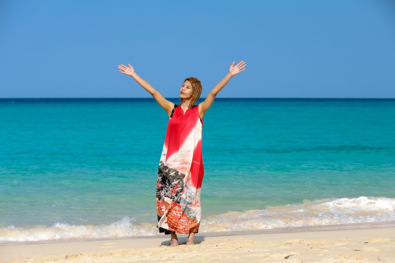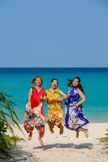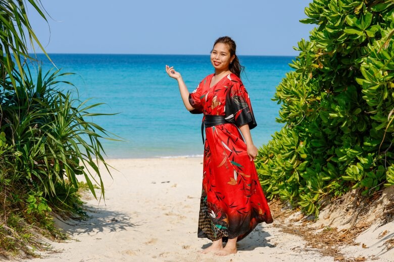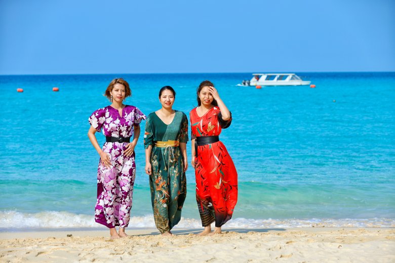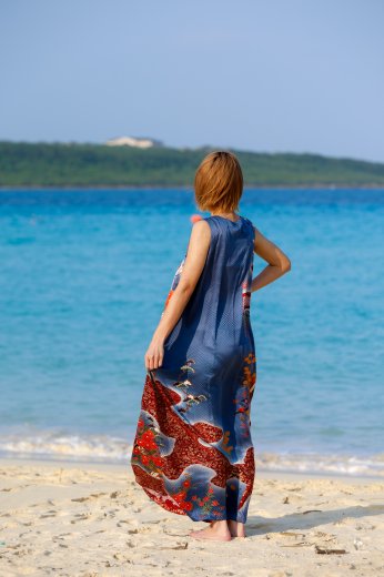 世界的にも評価の高い日本の絹のデザインを、海で、街で、ちょっとお洒落な空間で1着1着に島民が愛を込めて仕上げております♪