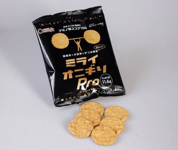 トップアスリートなど多くのアスリートの食をサポートする「一般社団法人食アスリート協会」監修。厳選された国産米、鰹節、大豆粉を使用し、たんぱく質がもっとも吸収されやすくなるアミノ酸スコア100のアスリートせんべい。1袋でゆでたまご2個分と同等のたんぱく質量(11.6g)が摂れ、運動直後のエネルギー補給や、食事で足りない炭水化物とたんぱく質を手軽にチャージできる噛むプロテインチップスです。