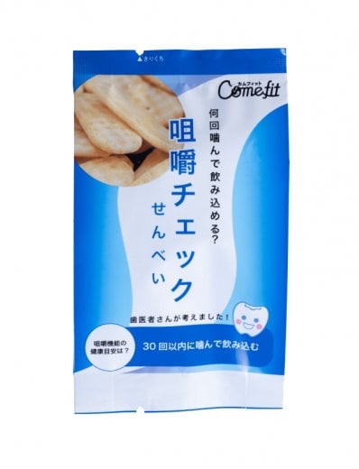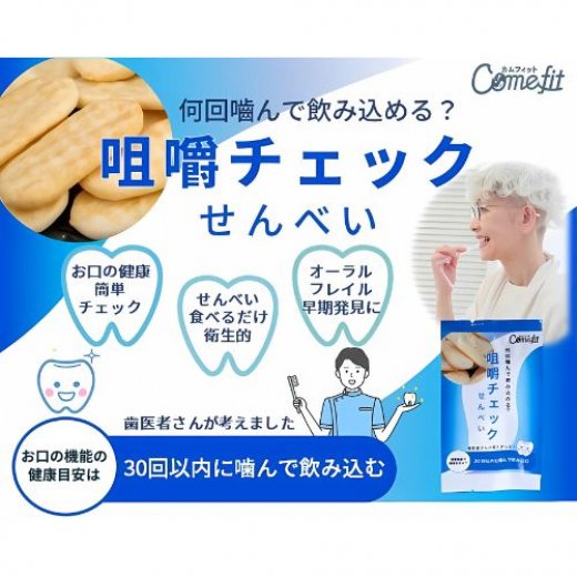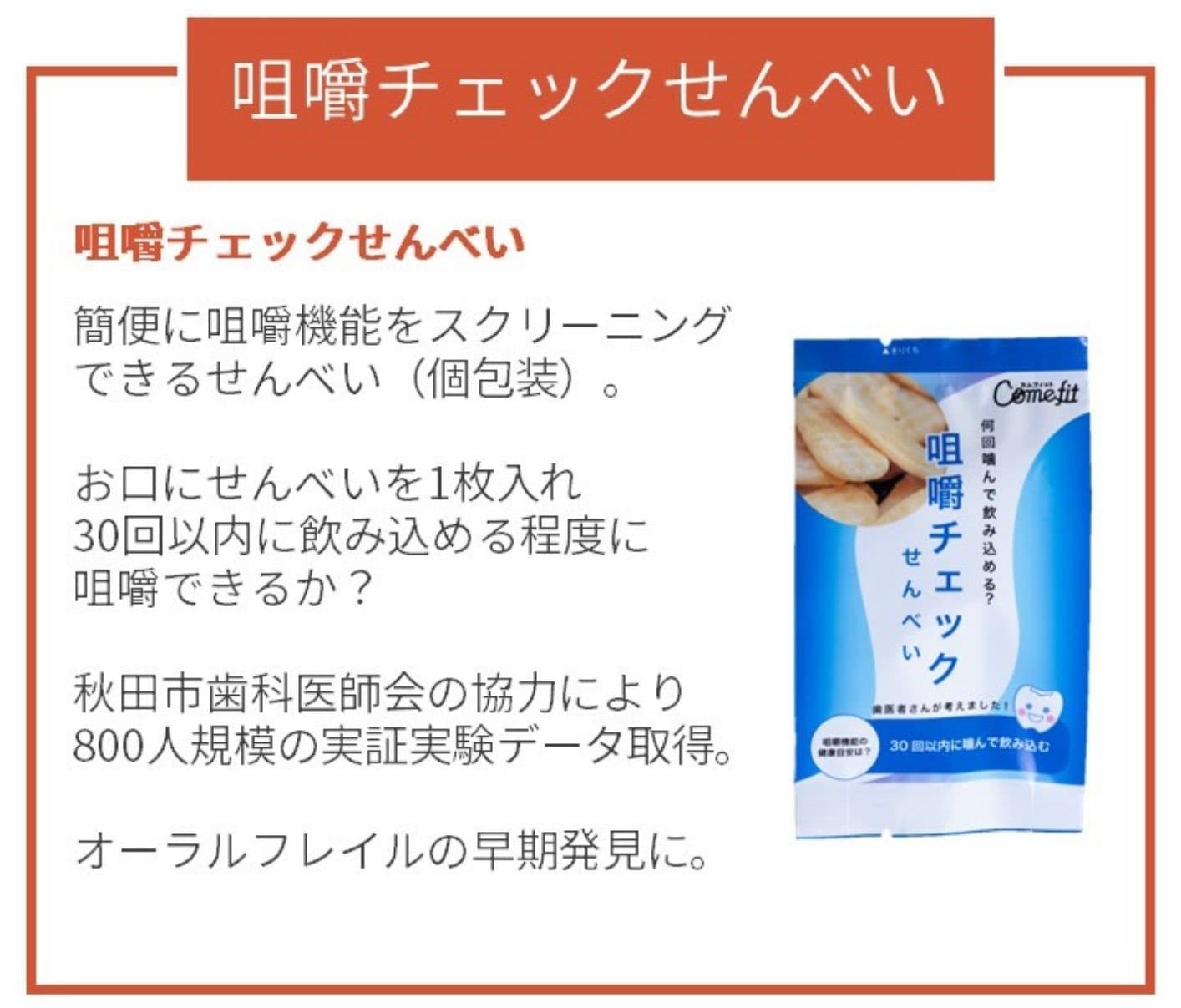 オーラルフレイルの早期発見に!せんべい1枚を30回以内で飲み込めるかでお口の健康状態を手軽にチェックできます(成人対象)。原料は国産米と少しの塩と砂糖のみ。美味しく食べて楽しくお口の健康状態をスクリーニングできます。秋田市歯科医師会協力の800人規模実証データ取得。