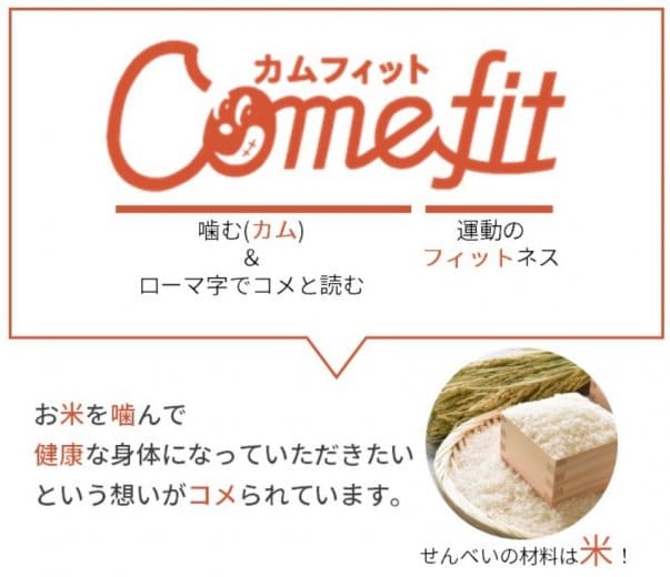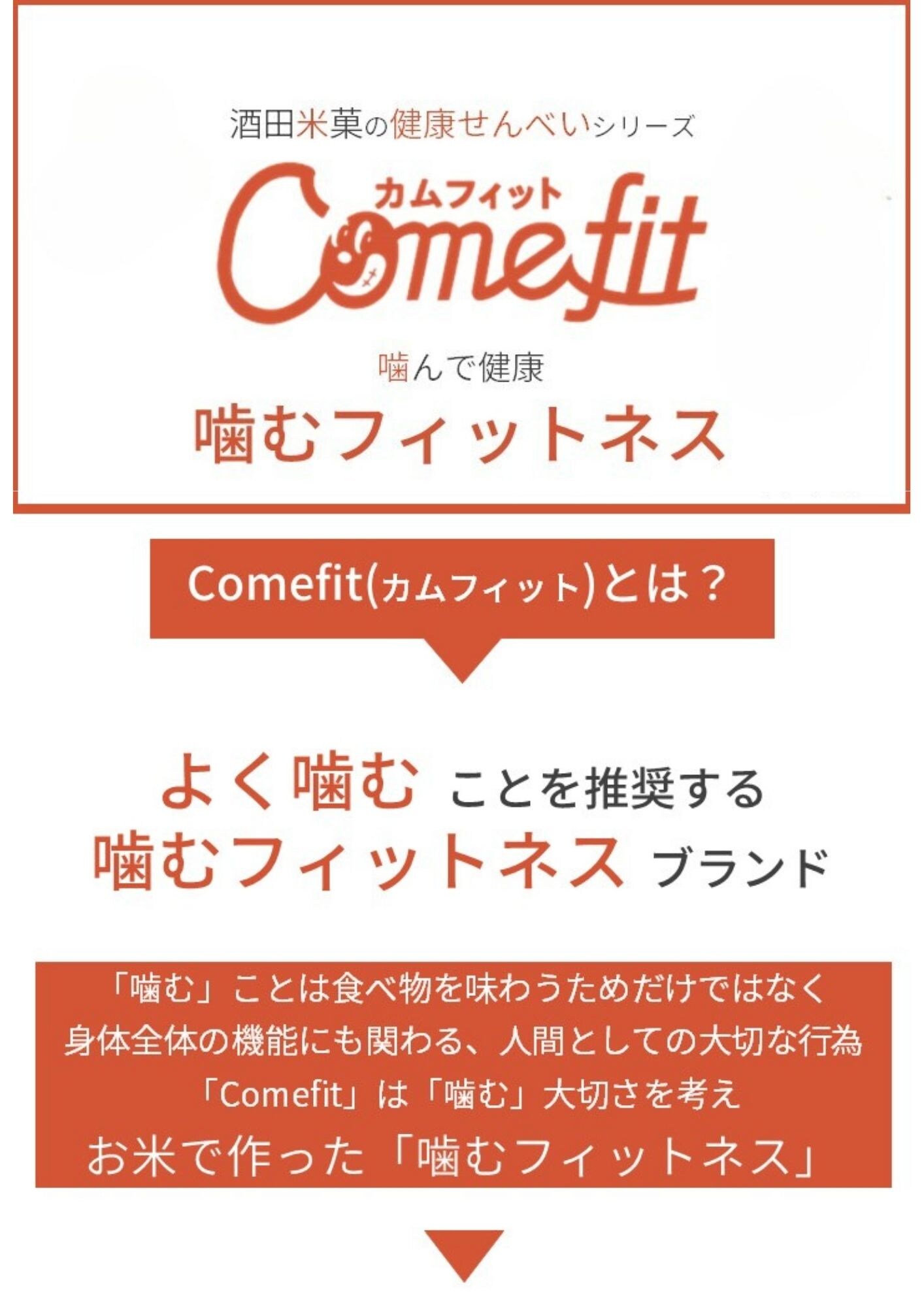 “噛むフィットネス”を合言葉に、よく噛むことを通じて カラダ・脳・心の健康を守ることを目的に生まれた酒田米菓の新ブランドです。噛む(カム)+米(コメ)+フィットネスを掛け合わせたネーミングには「お米を噛んで元気になってほしい」という想いが込められています。