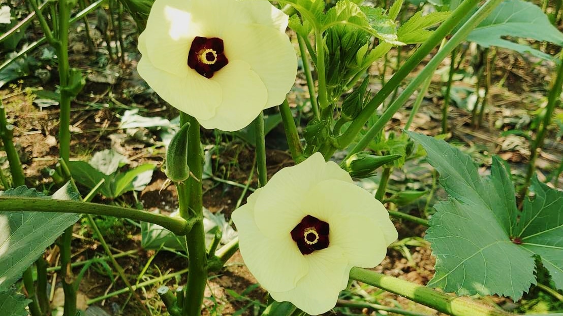 きれいに咲いたオクラの花 淡い黄色と緑のコントラストがとても綺麗 日ごとに大きくなるオクラはいよいよ収穫期に |