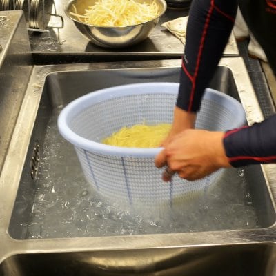 毎朝、製麵所で作る自家製麺は茹でた後に冷水でぬめりを落とした後、キンキンに冷えた氷水で麺を「キュッ」っと締めます。そうすることでツルツル&モチモチな食感が生まれ、鰹の効いた濃厚なつけダレと相性抜群となります。