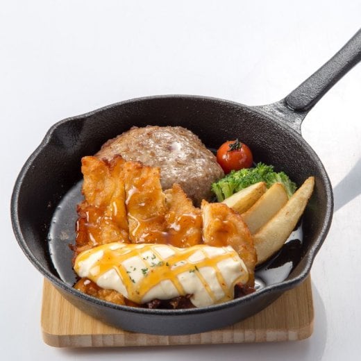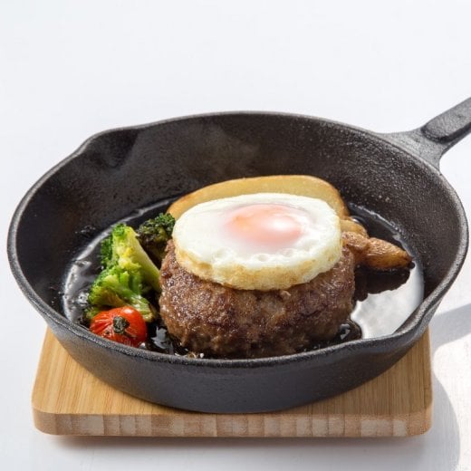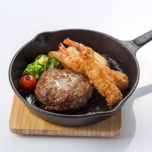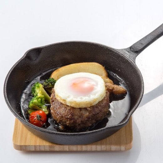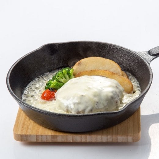 フライパンで焼いたあと、オーブンで仕上げ、熱々の鉄板へのせてお出ししています。