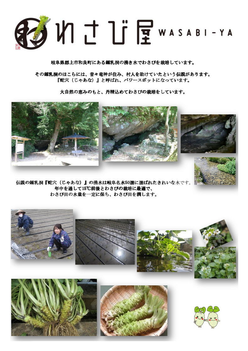 わさび屋が生産・販売をしているわさびは、岐阜県郡上市和良町で栽培されている「蛇穴【じゃあな】清水」の鍾乳洞の湧水を使用して栽培されています。