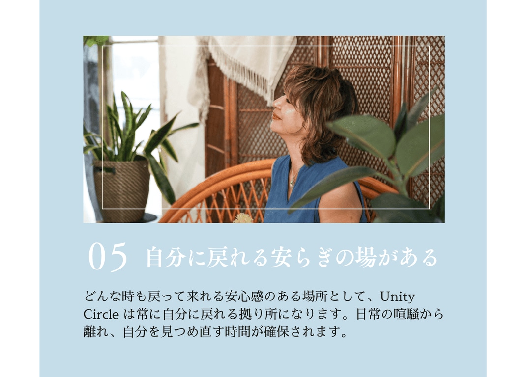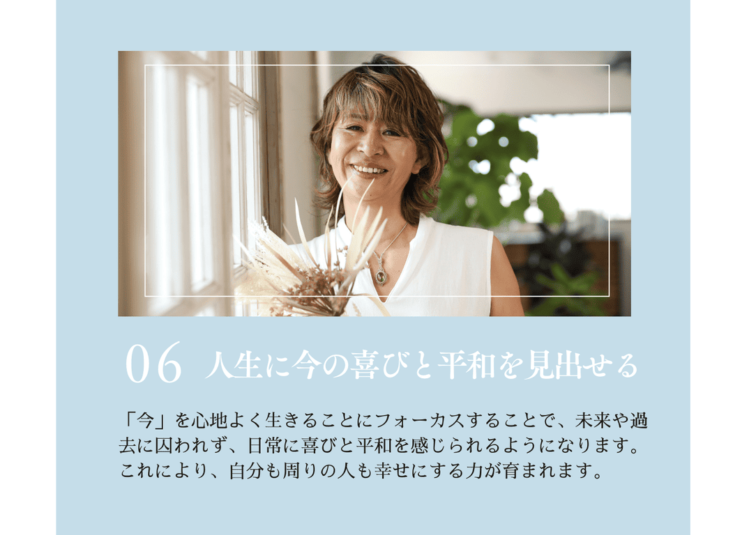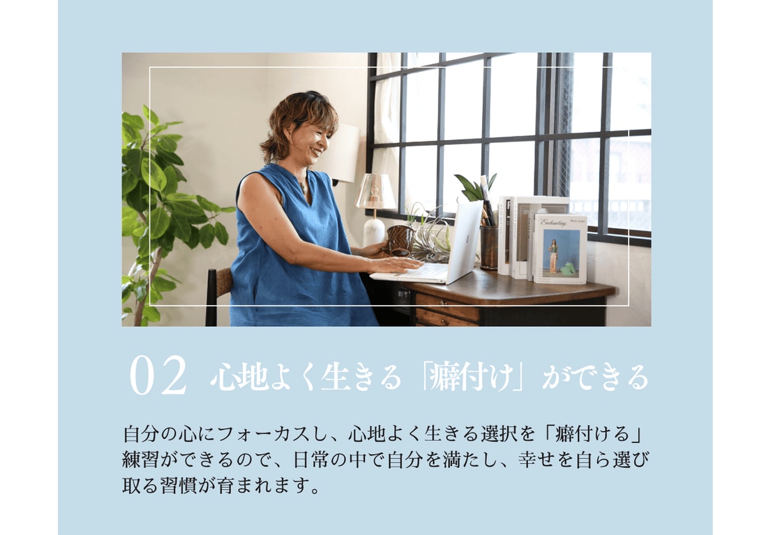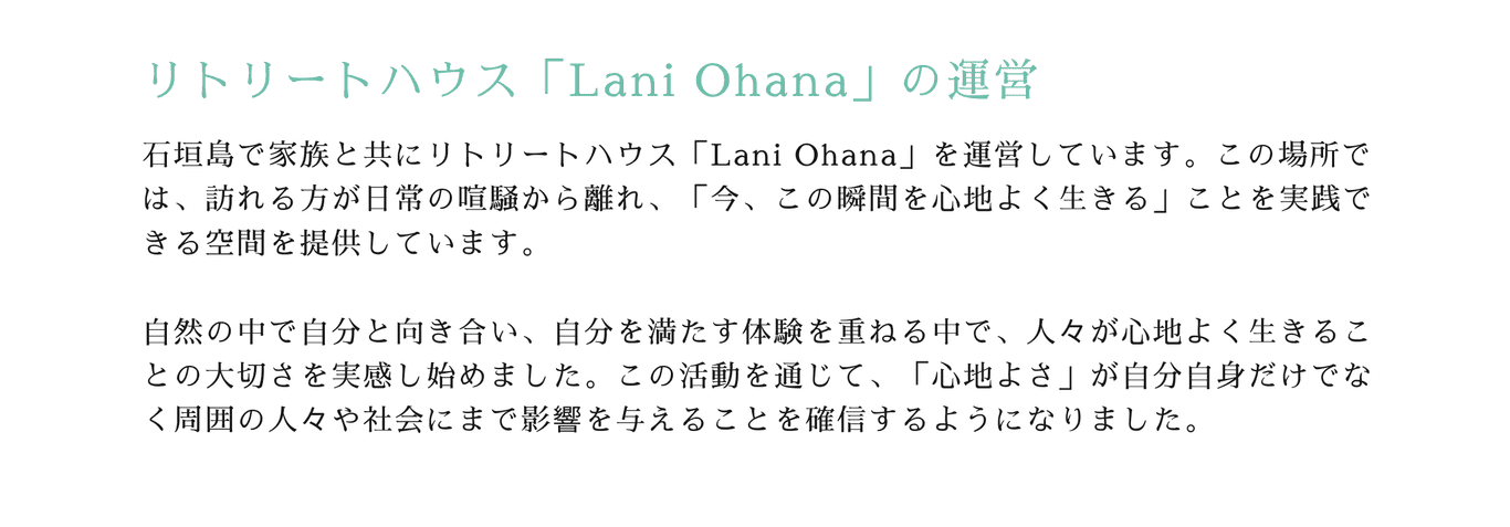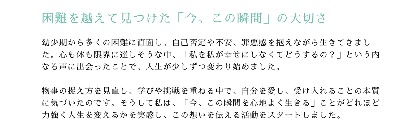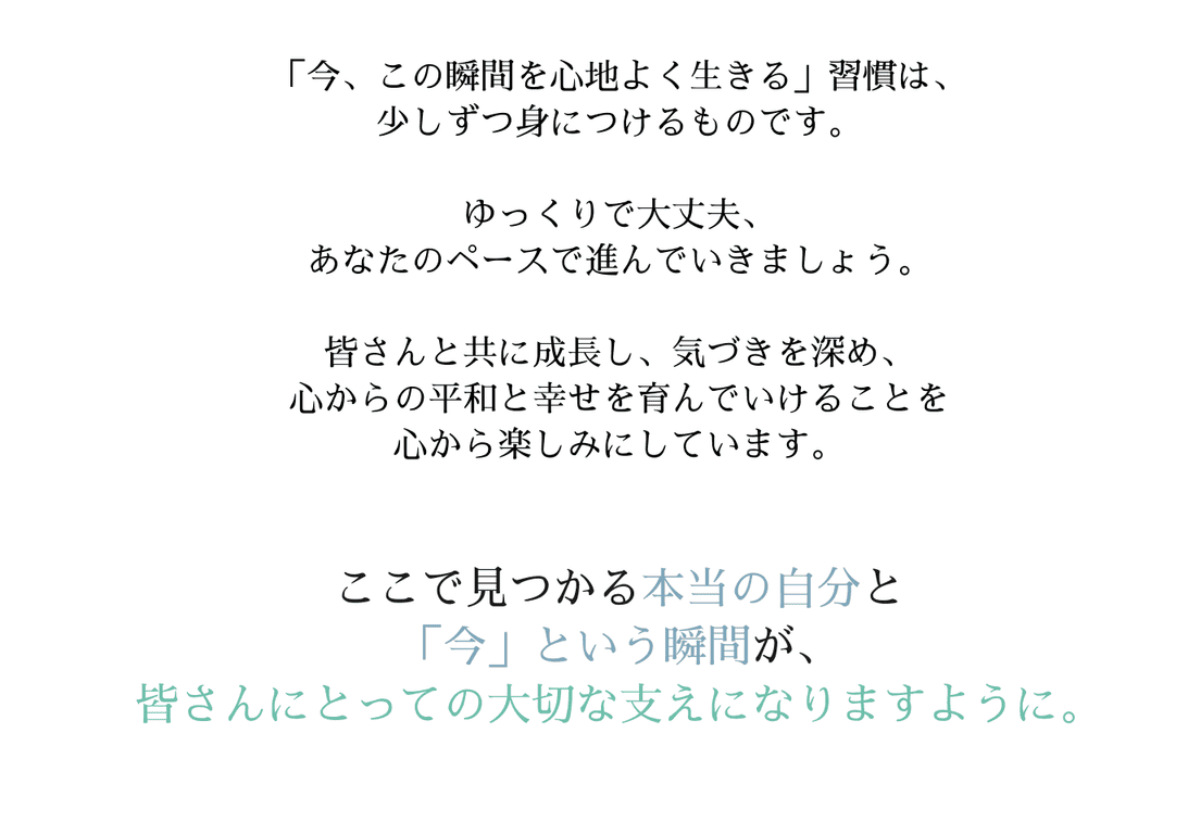 忙しい日常の中で、何気なく自分自身と向き合い、ただ成長を求めるのではなく、本当に自分のために心地よいことを選べるようになり、リラックスしながら「今、この瞬間」を大切にすることを目指しています。