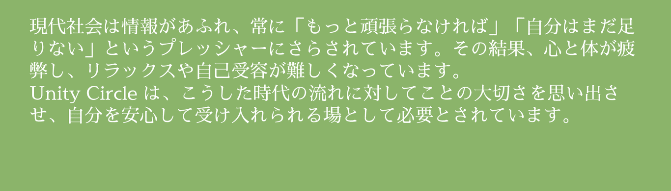 このサークルでは、参加者同士が気づきを分かち合い、共に笑い、時には涙しながら、現代社会の「もっと頑張らなくては」というプレッシャーからそっと解放され、自然体でいられる「癖」を身に着けていきます。