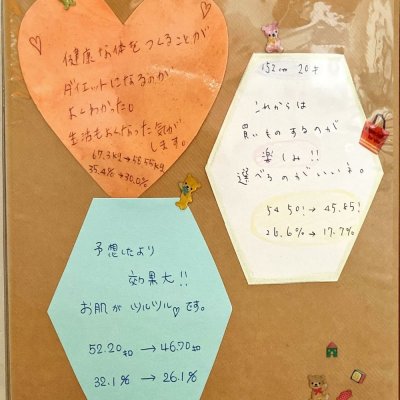「本当にやせるのかな?」と、はじめは少し不安感がありました。 カウンセリングを聞いてみると自分が何故太ったのかとか、 どこまで痩せることができるのかが解り、旦那と決心をし、2人で一緒に始めました。 きっと落ちないだろうと思っていた自分の予想とは全く現実は違い、見る見る体重が 落ちてきました。 3ヶ月ではなく、あと1ヶ月延長して20kg減らすことができました。 服をどの店でも選べる喜び!楽しみ!を毎日実感しております。 周りからも「痩せたね!奇麗になったね!」と言われました。 私がダイエットに成功した一番のきっかけは、ダイエットを指導してくれた 先生がいたからだと思います。 本当に感謝しています。 ありがとうございました。 |
