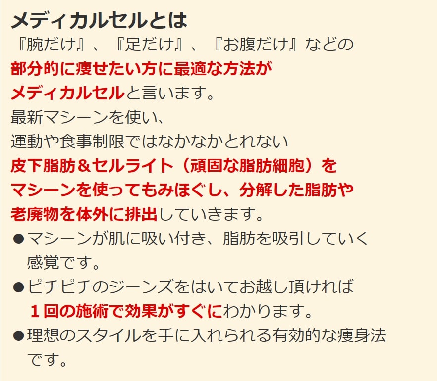 耳つぼダイエットで体重・体脂肪を落として卒業していかれる多くの方からの 『太ももだけもう少し細くなりたい』 と言ったお声にもお応えするためにメディカルセルを導入しました。