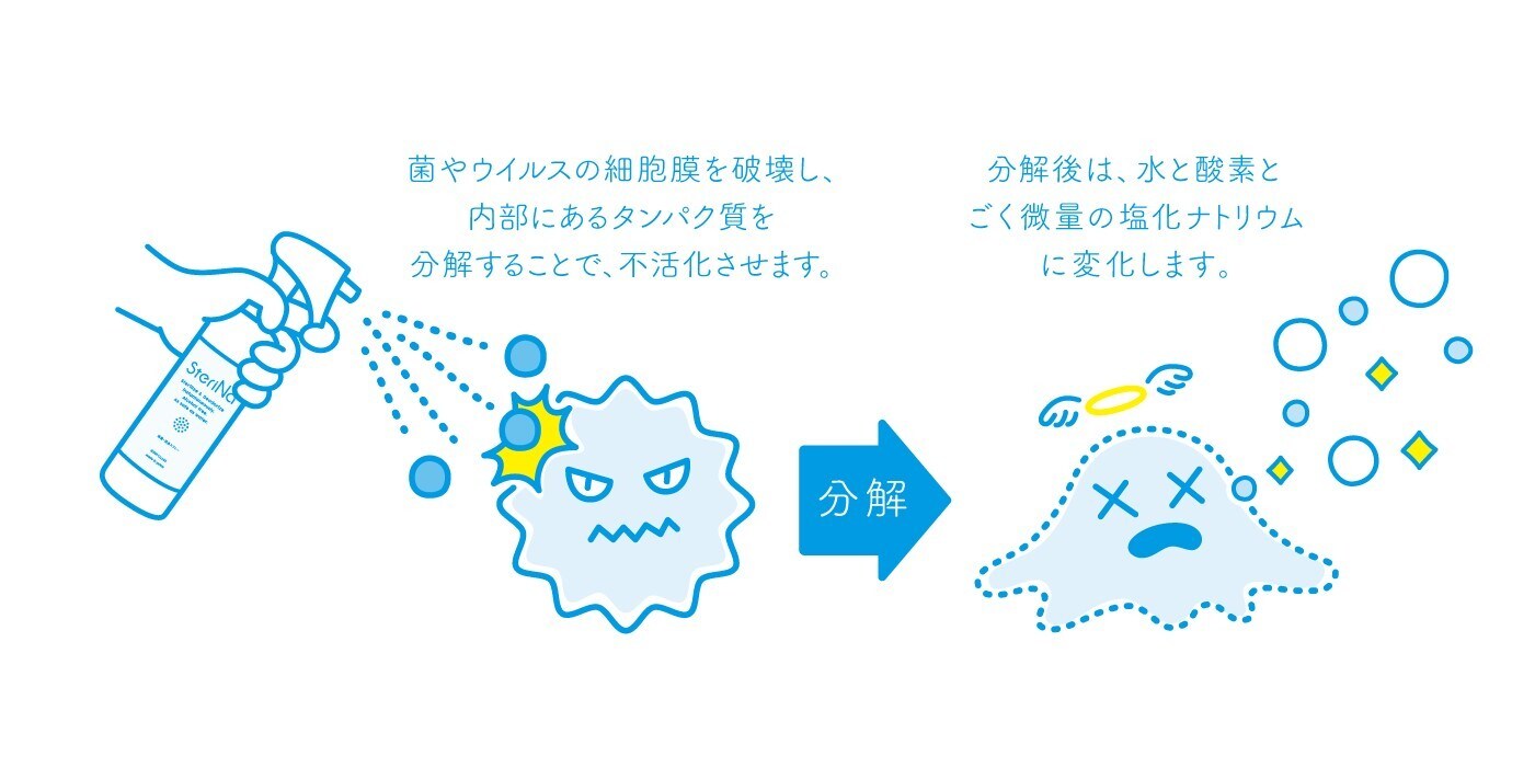 SteriNaは『次亜塩素酸“ナトリウム”』であり、『次亜塩素酸“水”』ではありません。