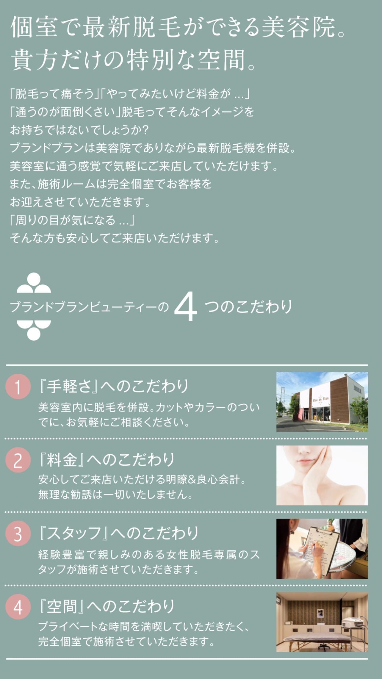 『Blan de Blan(ブラン ド ブラン)』では美容院でありながら最新脱毛機を併設。美容院に通う感覚で気軽にご来店していただけます。また、施術ルームは完全個室で「周りの目が気になる...」そんな方も安心してご来店いただけます。