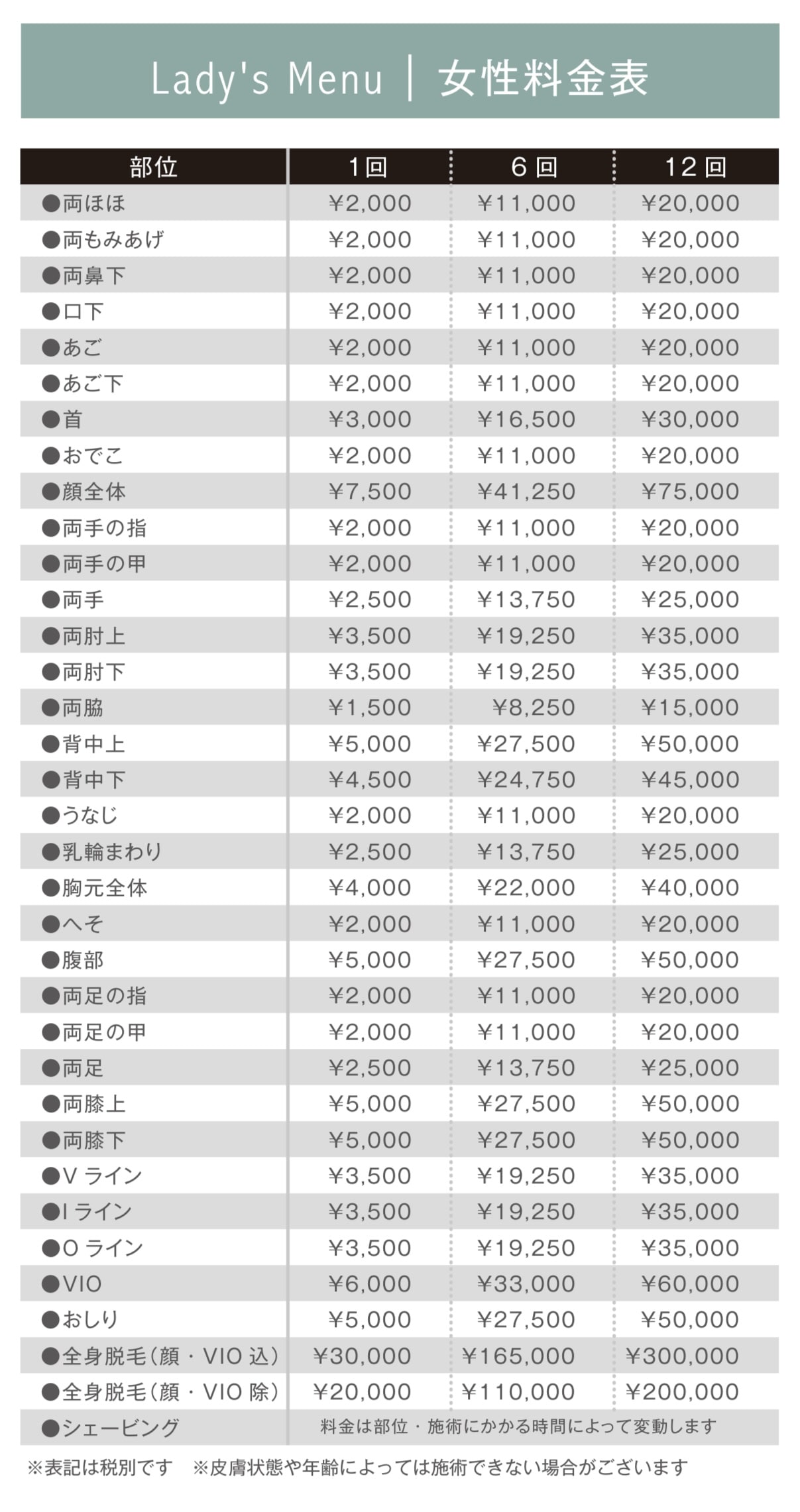 ※表記は税別で、1回の料金です。お得な6回、12回コースもありますのでお気軽にご相談ください。