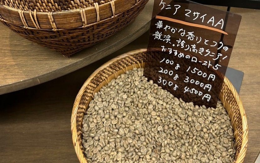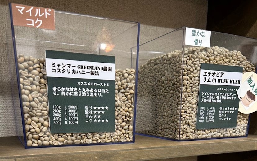 そのため当店では、生豆(なままめ)、いわば緑の豆の状態で陳列しています。 生豆は劣化が遅く、保存に適していますので、いつでも焙煎仕立てのフレッシュな状態のコーヒー豆をお届けいたします。