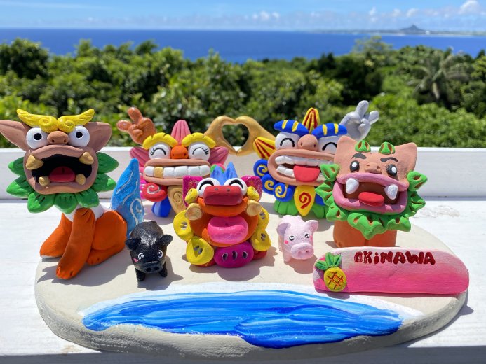 沖縄らしい小物アイテムや野球ボールやメガネなどのアイテムをシーサーに添えてトッピングできる、簡単に可愛く仕上がる『まいまいシーサー』が作れるのはここだけ!