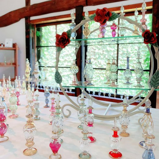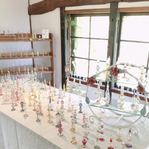 この香水瓶に香油を入れて並べておくだけで、まるで魔法使いのアトリエのように見えてきます。