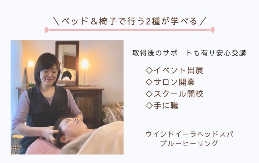 最短4日で資格取得|未経験OK|家族を癒すヘッドスパ基礎コース①②と上級ヘッドスパコース④⑤⑥の講師としての仕事と、ベッドで行う眼筋ゆらし上級ヘッドスパ&椅子に座って行うヘッドスパ2種の施術が可能|サロン&スクール開業サロンメニュー:60分8,000円〜10,000円でメニュー化できる!(料金設定は自由)